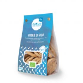 **Farina di riso, *BURRO, **zucchero di canna, *farina di GRANO tenero tipo 0, **gocce di cioccolato 9,5% (cacao: 45% minimo) (**zucchero di canna, **pasta di cacao, **burro di cacao, emulsionante: *lecitina di SOIA , **estratto di vaniglia, misto d’UOVO pastorizzato, agente lievitanti: bicarbonato di sodio, *amido di mais, correttore di acidità: acido citrico *ingrediente biologico **ingrediente biologico e di filiera equosolidale