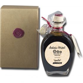 Aceto balsamico dal sapore corposo e dalla buona densità, dall’aroma deciso ed al tempo stesso dolce. L'unico ingrediente è il mosto d'uva cotto che è acetificato ed affinato in botti di legno pregiato. Da gustare goccia dopo goccia per insaporire formaggi, frittate, carni, primi piatti, frutta o gelato. Confezione regalo con scatola e tappo dosatore.