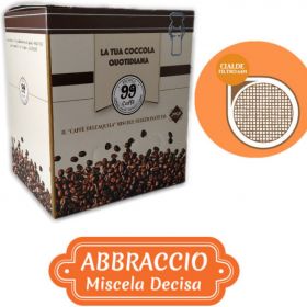 La miscela abbraccio è forte e decisa come un Abbraccio! E' il tipico espresso Bar all'italiana! Caratterizzata da pregiati chicci di Robusta Top Quality che donano corpo e persistenza che contraddistinguono i caffè che sferzano il nostro animo e svegliano il nostro corpo! Una carica di caffeina di cui non potrai fare a meno, propio come un 'Abbraccio'.