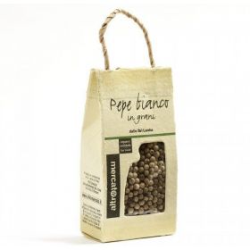 Note aromatiche più delicate rispetto al nero Il pepe bianco deriva dal solo seme del frutto e si ottiene tenendo a bagno per circa una settimana il frutto del pepe, in questo modo la polpa si decompone e può facilmente essere eliminata. Rimossa la parte esterna, il seme viene essiccato. Le confezioni sono realizzate artigianalmente in carta fatta a mano a partire da fibre naturali.