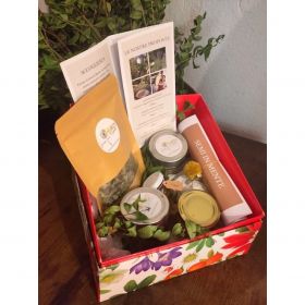 Cassettina di cartone interamente riciclabile, contiene: 1) Olio 500 ml dop 2) Vino Bianco Grillo 3) Una marmellata di mandarino 4) Mandorle tostate con il sale 250gr 5) Avocado 3 pezzi