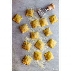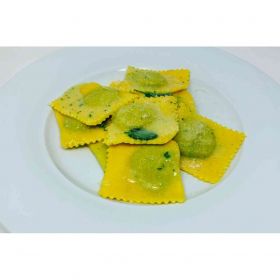 Ravioli ricotta e spinaci. Ingredienti uova fresche pastorizzate biologiche da galline allevate a terra, farina di grano tenero Molino Paolo Mariani, grani 100% italiani. Per il ripieno ricotta di pecora dell'Azienda Agricola Zerbino