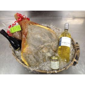 Il cesto contiene: un prosciutto stagionato con osso tipico Umbro, una bottiglia di vino Grechetto dell'Umbria, sale al tartufo pregiato di Norcia, una bottiglia di birra artigianale "birrificio di Spello", un sacchetto di lenticchie dell'altopiano di Colfiorito.