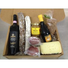 Bottiglia di vino igt di Montefalco, vino bianco dell'Umbria, salame 1, salame morbido 1, lenticchia di colfiorito 1, miele umbro 1, mezza forma di pecorino semi st. umbro