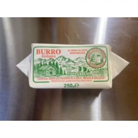 Ingredienti: pura panna. Dimensioni:Panetto 500 g: 15x4x8 cm; confezione da 20 pezzi. Panetto 250 g: 10x4x6 cm; confezione da 40 pezzi. Peso: 500 g o 250 g Shelf life: 90 giorni Conservazione: temp.4-6 °C , umid. rel. 85% CARATTERISTICHE CHIMICO-FISICHE E VALORI NUTRIZIONALI MEDI (su 100g) Umidità: 15% Proteine: 1 g Grassi: >85 g Carboidrati: 0 g Valore energetico: 750 Kcal CARATTERISTICHE ORGANOLETTICHE Colore: panna, tendente al giallo paglierino Sapore: deciso, aromatico Consistenza: fondente Aspetto: pasta compatta