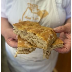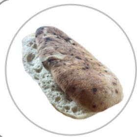 Cotta nel forno a legna, lievitata con lievito madre, certificata bio, prodotta con 50 % farina di grano tenero tipo “0” e 50% farina di grano tenero tipo “2” da grano coltivato in azienda con aggiunta di olio extra vergine di oliva bio, sale e olive