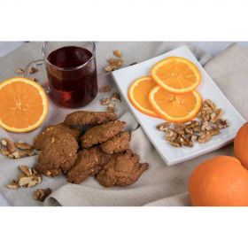 Farina di riso integrale, Zucchero integrale di canna Mascobado, Noci, Burro vegetale, Amido di riso, Buccia d'arancia, Lievito (amido di mais, tartrato di potassio estratto dalle uve, bicarbonato di sodio), Sale marino integrale