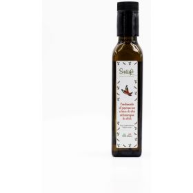 Disponibile nel formato da 250ml Ingredienti: Olio extravergine di Oliva Sadafè (98%), peperoncino essiccato locale (2%).
