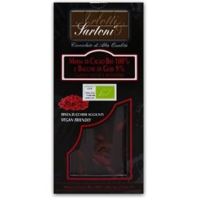 GUSTO BENESSERE E SALUTE. Questo è uno dei prodotti di punta della nostra produzione. Massa di Cacao Bio proveniente prevalentemente dalla Repubblica Dominicana emulsionata con Burro di Cacao Bio. Questa tavoletta non ha zuccheri aggiunti e non è adatta a tutti. L’aggiunta di Bacche di Goji Bio apporta alla tavoletta le loro proprietà; straordinarie antinfiammatorie in generale ma soprattutto la regolazione dello zucchero nel sangue contrastando sia il colesterolo che i radicali liberi.