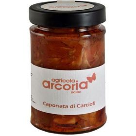 ingredienti: Carciofi a spicchi , sedano, capperi, olive verdi Nocellara Etnea, cipolla , passata di pomodori, uva passa , vergine di oliva, aceto, zucchero , estratto di pomodoro , pinoli.