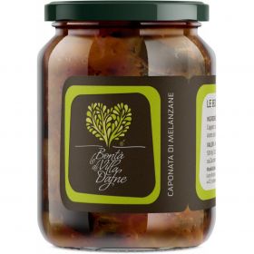 Melanzane 40%, salsa di pomodoro 20%, carote, sedano, cipolla, aceto di vino bianco, olive verdi, capperi, zucchero, basilico, sale, pepeAllergeni