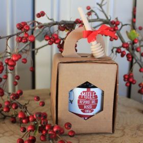 Confezione regalo con un vaso miele da 250 gr con mollettina natalizia per biglietto auguri.