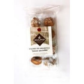 Una vera particolarità alle mandorle senza farina e grassi aggiunti con l'amarena intera messa dentro a mano, una per una. Dolce morbido alla mandorla vanigliata ripiena di amarena intera. Vaschetta da 200 gr
