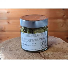 Zucchine,acqua,aceto di vino bianco (solfiti),vino bianco (solfiti),zucchero di canna,fior di sale di Trapani,pepe bianco muntok,dragoncello.
