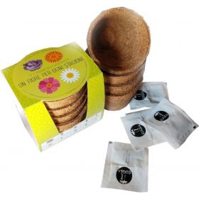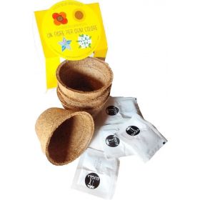 La confezione contiene: 4 bustine di semi: Papavero (rosso), Nigella (blu), Girasole nano (giallo), Alisso (bianco) 4 vasetti di 150ml di fibra di cocco per la semina iniziale. Dopo qualche settimana è consigliato il trapianto in un vaso più grande.