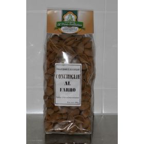 Pacchetto da 500 g di pasta artigianale con farina integrale di farro biologica (non certificata) di nostra produzione. Farina macinata a pietra e pasta trafilata al bronzo, a lenta essiccazione. Tipo di pasta: conchiglie. Cottura: 5/6 minuti. Apporto energetico per 100 g di prodotto: 335 Kcal.