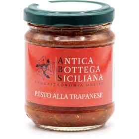 Il pesto alla Trapanese è il condimento per il primo piatto siciliano per eccellenza, pochi ingredienti che sprigionano una immensità di sapori e profumi. Ingredienti: Pomodoro rosso, olio extra-vergine di oliva, basilico, mandorle, aglio rosso di Nubia, sale, pepe. Lavorazione: Il basilico e i pomodori vengono selezionati e lavati manualmente, successivamente vengono frullati insieme all’aglio rosso di Nubiae alle mandorle; il tutto viene infine condito con olio EVO, sale e pepe. Peso netto: 180 grammi