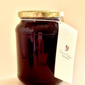 Miele millefiori con prevalenza nettare di erba medica e melata di quercia, colore rosso scuro, dal sapore intenso, di fieno, di mosto d'uva.