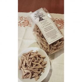 Caserecce a base di farina di grano tenero e favino macinate a pietra naturale, trafilate al bronzo ed essiccata lentamente. 400gr