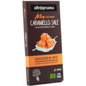 Mascao al latte con cristalli di caramello e sale è un cioccolato biologico, goloso e croccante che regala una sorprendente armonia di sapori: il gusto morbido del caramello è spezzato dal leggero sapore del sale che si avverte in un secondo momento, regalando equilibrio.