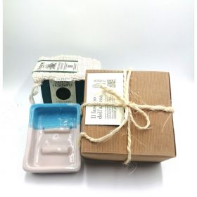 Contiene: 1 Sapone di Aleppo solido Al 16%, 1 Sapone Nero, 1 Guanto in Canapa + cartolina di auguri e dono in ceramica solidale