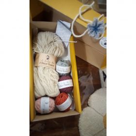 Confezione regalo con una matassa di lana bianca fine ,quattro gomitoli di lana colorata con pigmenti naturali assortiti con uncinetto e schema per mattonella granny