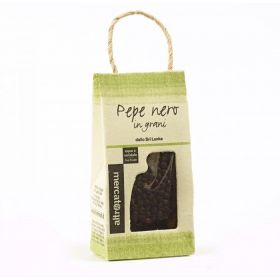 Il pepe nero in grani proviene dai giardini di spezie dello Sri Lanka, ha un profumo intenso e se mescolato a quello bianco crea un equilibrio aromatico perfetto. La confezione è realizzata artigianalmente in carta fatta a mano a partire da fibre naturali. Ogni confezione di pepe nero contiene inoltre alcune ricette da provare con questa spezia.
