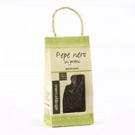 Il pepe nero in grani proviene dai giardini di spezie dello Sri Lanka, ha un profumo intenso e se mescolato a quello bianco crea un equilibrio aromatico perfetto. La confezione è realizzata artigianalmente in carta fatta a mano a partire da fibre naturali. Ogni confezione di pepe nero contiene inoltre alcune ricette da provare con questa spezia.