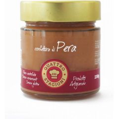 “La Pera” è una confettura dolce realizzata con materie prime fresche e di alta qualità. È un gusto non comune ma che porta con se un oltre a un utilizzo classico della confettura anche un ottimo abbinamento con i formaggi. Vegan ok e Gluten Free
