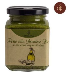 Da oggi è possibile gustare tutto il sapore del frutto più ambito del territorio etneo in un pratico vasetto da 190 grammi. Il pesto di pistacchio: realizzato esclusivamente con il rinomato pistacchio di Bronte sgusciato e lavorato con la sola aggiunta di sale, pepe e olio extravergine di oliva (70%). Adattabile a numerosi piatti dalle Bruschette, al ripieno di succolenti carni, alla suo utilizzo più famoso la pasta (aggiungendo panna e prosciutto il successo è garantito). Si consiglia di conservarlo in un luogo fresco e asciutto e una volta aperto conservarlo in frigo per massimo una settimana. Enjoy it!