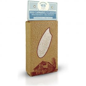 Il riso Carnaroli Classico è una varietà molto pregiata di riso superfino. Il sapore è netto, tendente al dolce, con chicco consistente ed elastico anche dopo la cottura. Il chicco si presenta grosso e lungo 7 mm circa, di forma allungata e colore ceruleo con perla centrale piccola e bianca. Lavorazione: è stato ottenuto nel 1945 dall’incrocio tra Vialone (con alto contenuto di amilosio che garantisce la tenuta in cottura) e il Lencino (riso lungo, grosso e molto perlato). Coltivato soprattutto in Lomellina, regno del riso, è ritenuto da molti gourmet il riso principe della cucina. Abbinamenti: ideale per risotti, timballi, risi al sugo. Non scuoce e il chicco non si disgrega. Per queste sue caratteristiche viene preferito nelle preparazioni di alta cucina; ma anche cuochi meno esperti possono ottenere grandi risultati. Curiosità: la sua fama deriva dall’eccezionale compattezza dei chicchi grossi e allungati con piccola parte centrale, l’alto contenuto di amilosio prossimo al 24% del totale amido, l’ottimo equilibrio tra buona capacità di assorbimento dei liquidi e bassa perdita di amido. Tempo di cottura: 16-18 minuti.