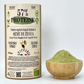 Queste polveri sono ottenute dalla lavorazione dei Semi di Zucca crudi integrali biologici privati della sua parte grassa