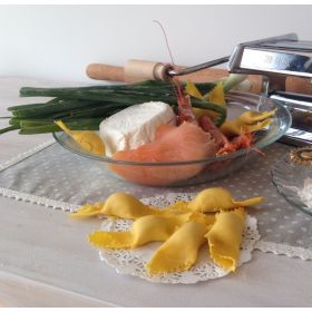 Pasta fresca all’uovo con ripieno a base di crema di salmone affumicato e gamberi. Una delle ricette più originali, preparata con crema di salmoni affumicati di pregiate specie ittiche combinata con gamberetti tritati grossolanamente. Passata di pomodori datterini con un filo di panna è l’accompagnamento più appropriato per gustare i particolari profumi e sapori del piatto. Ideale anche in l’estate: accompagnato solo da pomodorini freschi e panna è un primo fresco e leggero di assoluta eleganza.
