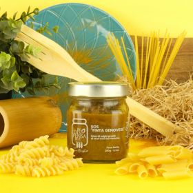 Pesto genovese classico, con basilico italiano, da miscelare con la pasta pronta cottura amalgamando con qualche cucchiaio di acqua della cottura.