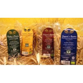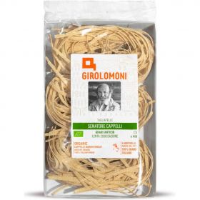 Questa pasta é prodotta utilizzando semola di grano duro: Cappelli, coltivato, con metodo biologico, dai nostri soci sulle colline marchigiane. Il Cappelli merita certamente un posto di privilegio fra le varietà di frumento duro di vecchia costituzione, perché è stata la prima varietá "eletta", selezionata da Nazareno Strampelli, il "mago del grano". Il nome ai piú non dirà niente, ma molti ricorderanno il filmato televisivo in cui Benito Mussolini lo mieteva e lo trebbiava. Era proprio il frumento duro Cappelli. Chiamato cosí, in onore del senatore abruzzese Raffaele Cappelli, promotore nei primi del '900 della riforma agraria. Il Cappelli è un grano ad alto contenuto proteico, esso si presenta maestoso ed alto nei campi. La notevole altezza di questo grano (puó raggiungere 180 cm) ha reso questa varietà difficile da coltivare perchè a rischio di continuo allettamento dovuto principalmente al vento e alle piogge. In condizioni di terreno ottimali e con un andamento climatico mite il Cappelli puó raggiungere una resa di 18÷23 q.li di produzione ad ettaro. La varietà Cappelli, la si puó definire comunque una "varietà eletta", sia perchè ha eccezionali caratteristiche proteiche ed organolettiche, sia perchè progenitrice di moltissime altre varietà coltivate ancora oggi. La pasta Girolomoni®, prodotta col 100% di semola ottenuta da questa varietà di frumento, è trafilata al bronzo ed essiccata a basse temperature in tempi molto lunghi (circa 12 ore per la pasta lunga e circa 8 ore per la pasta corta) al fine di mantenere tutti i principi nutritivi ed organolettici della materia prima anche nel prodotto finito.