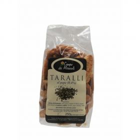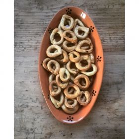 TARALLI REALIZZATI ARTIGIANALMENTE, SECONDO LA TRADIZIONE LOCALE, CHE PREVEDE UNA SCOTTAURA IN ACQUA BOLLENTE PRIMA DELLA COTTURA IN FORNO, GARANTENDO UNA PIACEVOLE CONSISTENZA FRAGRANTE