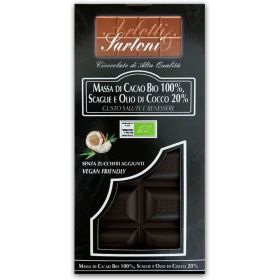 GUSTO BENESSERE E SALUTE. Questo è un dei prodotti di punta della nostra produzione. Massa di Cacao Bio proveniente prevalentemente dalla Repubblica Dominicana emulsionata con Burro di Cacao Bio. Questa tavoletta non ha zuccheri aggiunti e non è per tutti. L’aggiunta di Olio e Scaglie di Cocco Bio apport alla tavoletta le loro proprietà straordinarie: antinfiammatorie, proteggono il cuore e aiutano a ridurre lo stress, che insieme ai benefici ormai acclarati del Cioccolato ne fanno di questa tavoletta un pratico e piacevole alleato per la salute e il benessere.