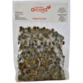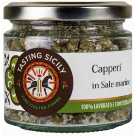 Capperi siciliani sotto sale confezionati in vasetto in vetro sterili. Ingredienti: Capperi siciliani, sale (25%). Lavorazione: I capperi vengono raccolti a mano e successivamente lavati. Infine vengono salati e confezionati. Peso netto: 230 grammi