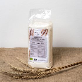 Farina semintegrale di farro biologico, ottenuta da molitura a pietra, in confezione di carta da 1 Kg.