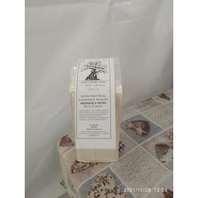 Macinate a pietra naturale, con mola in selce francese. La frantumazione è lenta (max 100 giri al minuto), in modo da non surriscaldare il chicco e preservarne al massimo le qualità organolettiche. Germe, profumi e sapori originari sono integralmente conservati. Si ottiene un prodotto ricco di fattori nutritivi, minerali e vitamine. Da grano biologico di nostra produzione. Integrale: la più rustica e ricca di fibre, può essere miscelata con altre farine per migliorarne la lavorabilità.