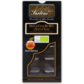 GUSTO SALUTE E BENESSERE. Questo è uno dei prodotti di punta della nostra produzione. Massa di Cacao Bio proveniente prevalentemente dalla Repubblica Dominicana. In questa tavoletta abbiamo sostituito lo Zucchero di Canna con il Succo D’Agave che ha un basso indice glicemico. Il gusto è intenso ma piacevole, adatto a chi desidera un prodotto importante ma non estremo mantenendo i benefici ormai acclarati del cioccolato.
