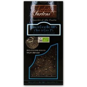 GUSTO BENESSERE E SALUTE. Questo è un dei prodotti di punta della nostra produzione. Massa di Cacao Bio proveniente prevalentemente dalla Repubblica Dominicana emulsionata con Burro di Cacao Bio. Questa tavoletta non ha zuccheri aggiunti e non è per tutti. L’aggiunta di Semi di Chia Bio, Un grande Superfood, apporta alla tavoletta proprietà straordinarie. Innanzi tutto i Semi di Chia contengono i benefici grassi Omega 3 (che in natura si possono trovare quasi esclusivamente in alcuni tipi di pesci) che hanno ottime proprietà antinfiammatorie, proteggono il cuore e aiutano la rigenerazione della pelle.