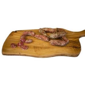 Sausage made with selected pork meat, salt and black truffles High Molise. The curing process is completed no earlier than six weeks. In this way the product reaches optimal ripeness that provides exceptional nutritional and dietary quality. When cut, the product has a color ranging from bright red to deep red; the fat parts occur in the right proportion compared with the lean and stand out for their white color. The aroma is rightly intense, characterized by rusticity notes and enriched by black truffles High Molise. Each vacuum-packed sausage is 230 grams.