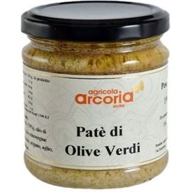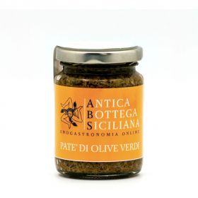 Il paté di olive verdi è un tipico antipasto della cucina siciliana, ottimo da spalmare sulle bruschette o sul pane croccante. Ingredienti: Olive verdi denocciolate, olio extra-vergine di oliva, olio di girasole, aceto, pepe, origano, sale. Lavorazione: Le olive verdi vengono lavate manualmente e tritate, l'impasto ottenuto viene condito con il resto degli ingredienti e confezionato. Peso netto: 90 grammi