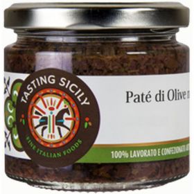 Il paté di olive nere è un tipico antipasto della cucina siciliana, ottimo da spalmare sulle bruschette o sul pane croccante. Ingredienti: olive nere affettate, olio extra-vergine di oliva, olio di girasole, aceto, pepe, origano, sale. Lavorazione: Le olive nere vengono lavate manualmente e tritate, l'impasto ottenuto viene condito con il resto degli ingredienti e confezionato. Peso netto: 90 grammi
